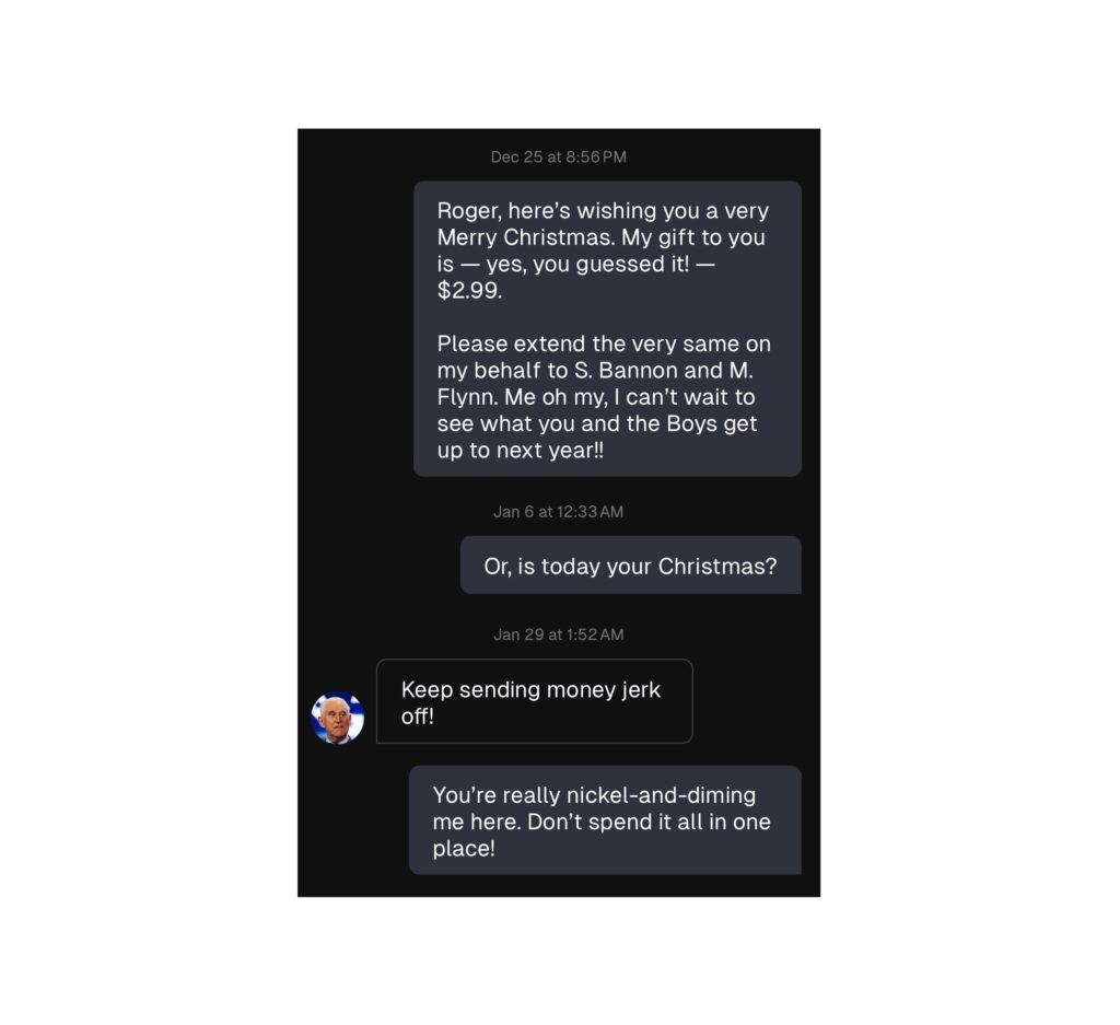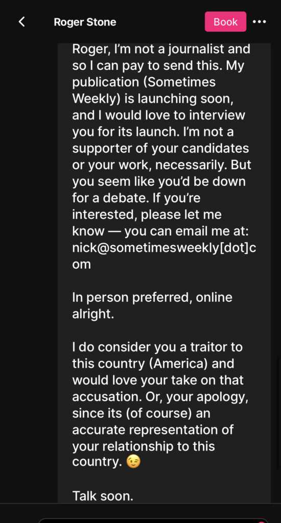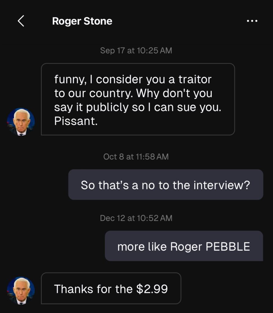 Full disclosure: To message Roger Stone, I pay $2.99 per message. To date, this has cost me $11.96.