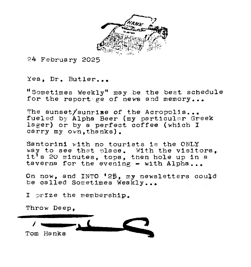 You can visit an official Letter from the Back Row of History in Athens, Greece! The letter was recited during a weekly gathering of The Symposium at the Athens-based restaurant Σόουλ Κίτσεν (Soul Kitchen) in early 2026. Subsequently, the letter was framed and placed on display at Σόουλ Κίτσεν where it remains exhibited today. Members are encouraged to visit the Athens Letter on pilgrimage.