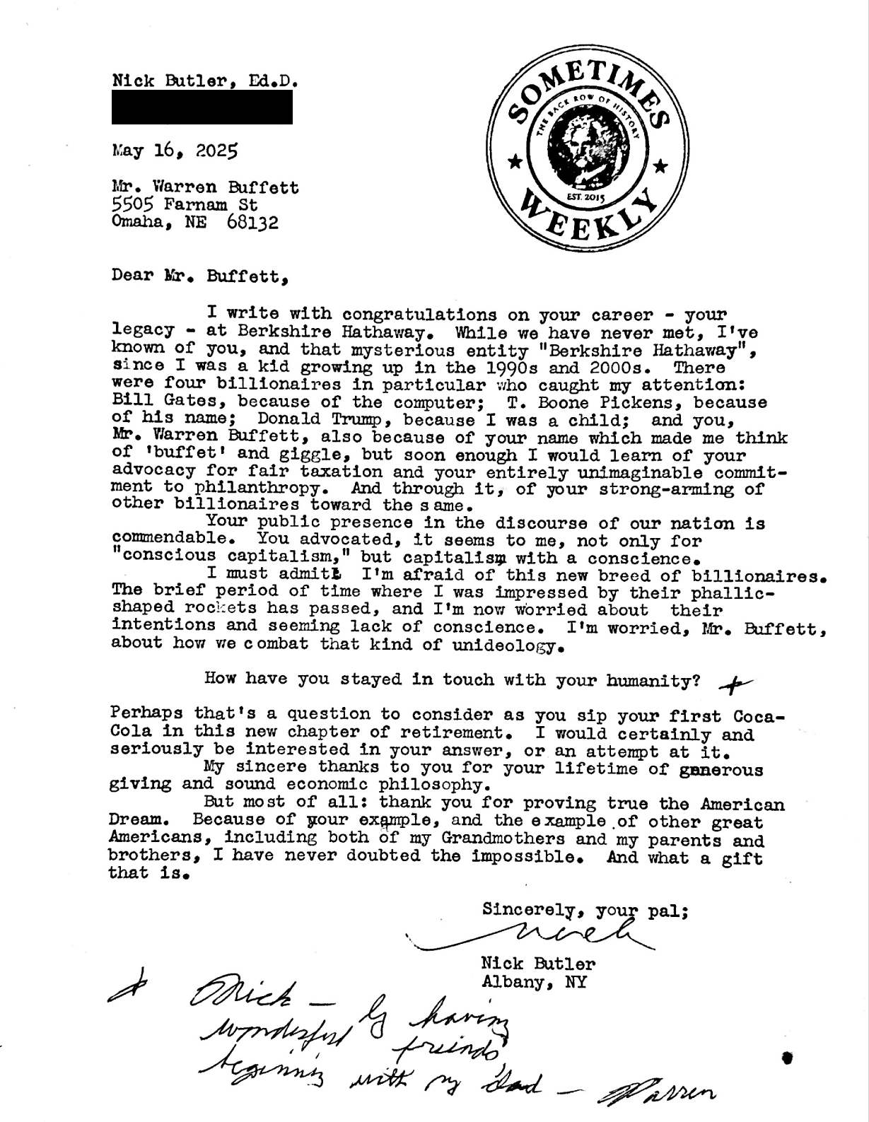 Sometimes Weekly occasionally corresponds with notable individuals. Consider reading On Writing Letters and browse the archived letters below.